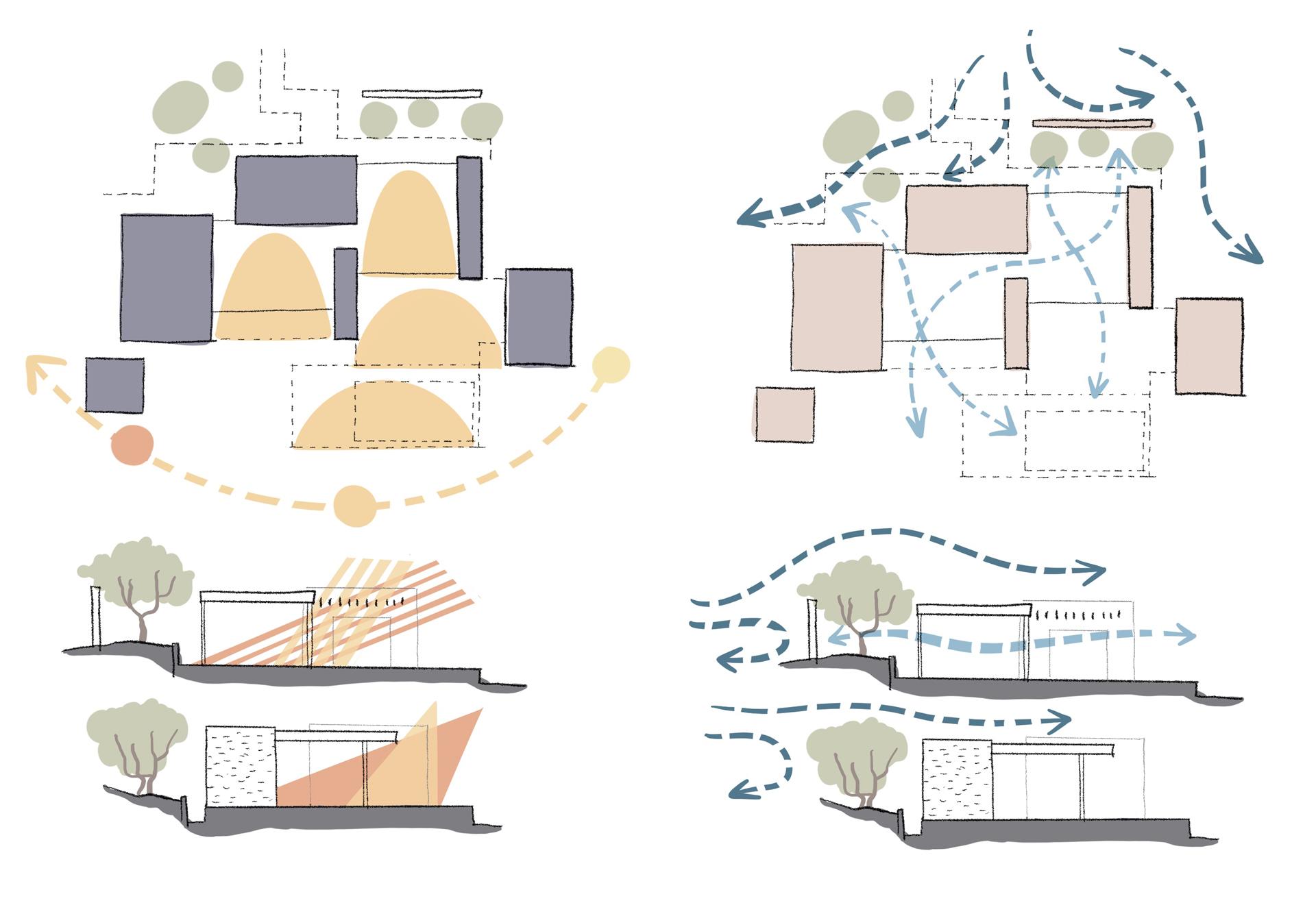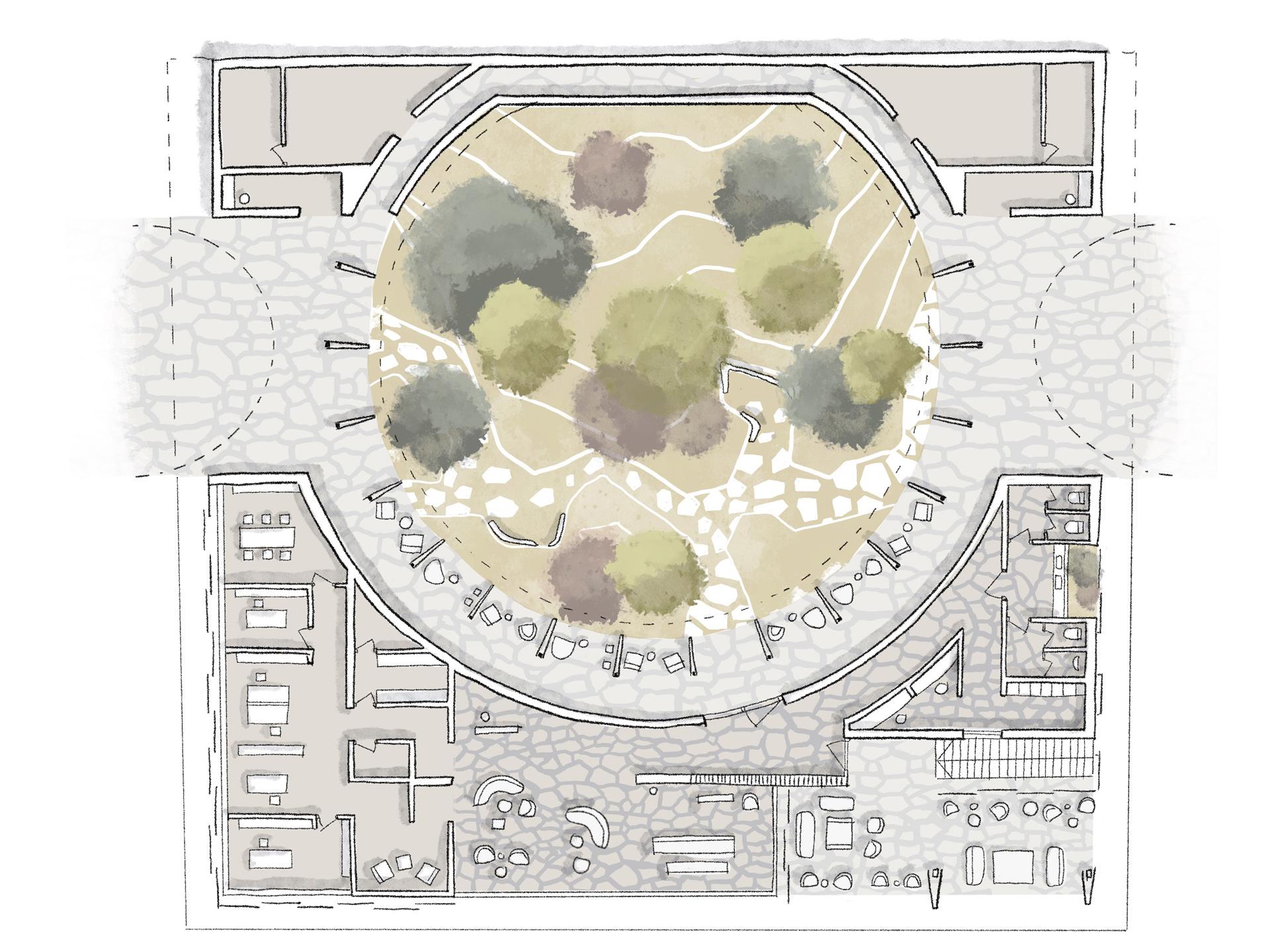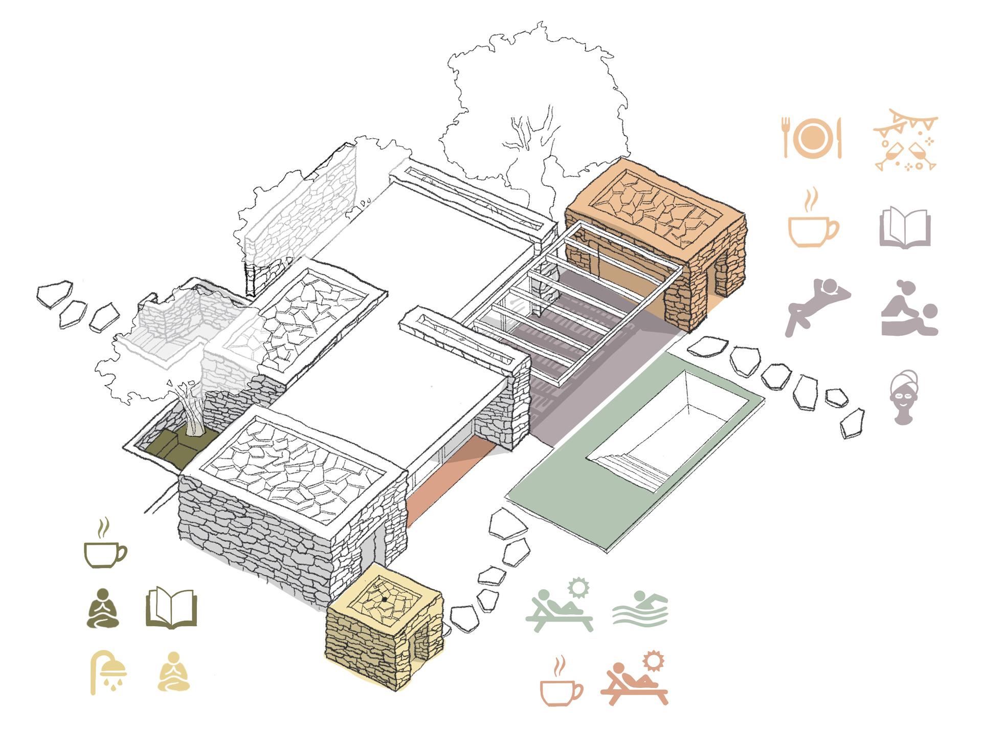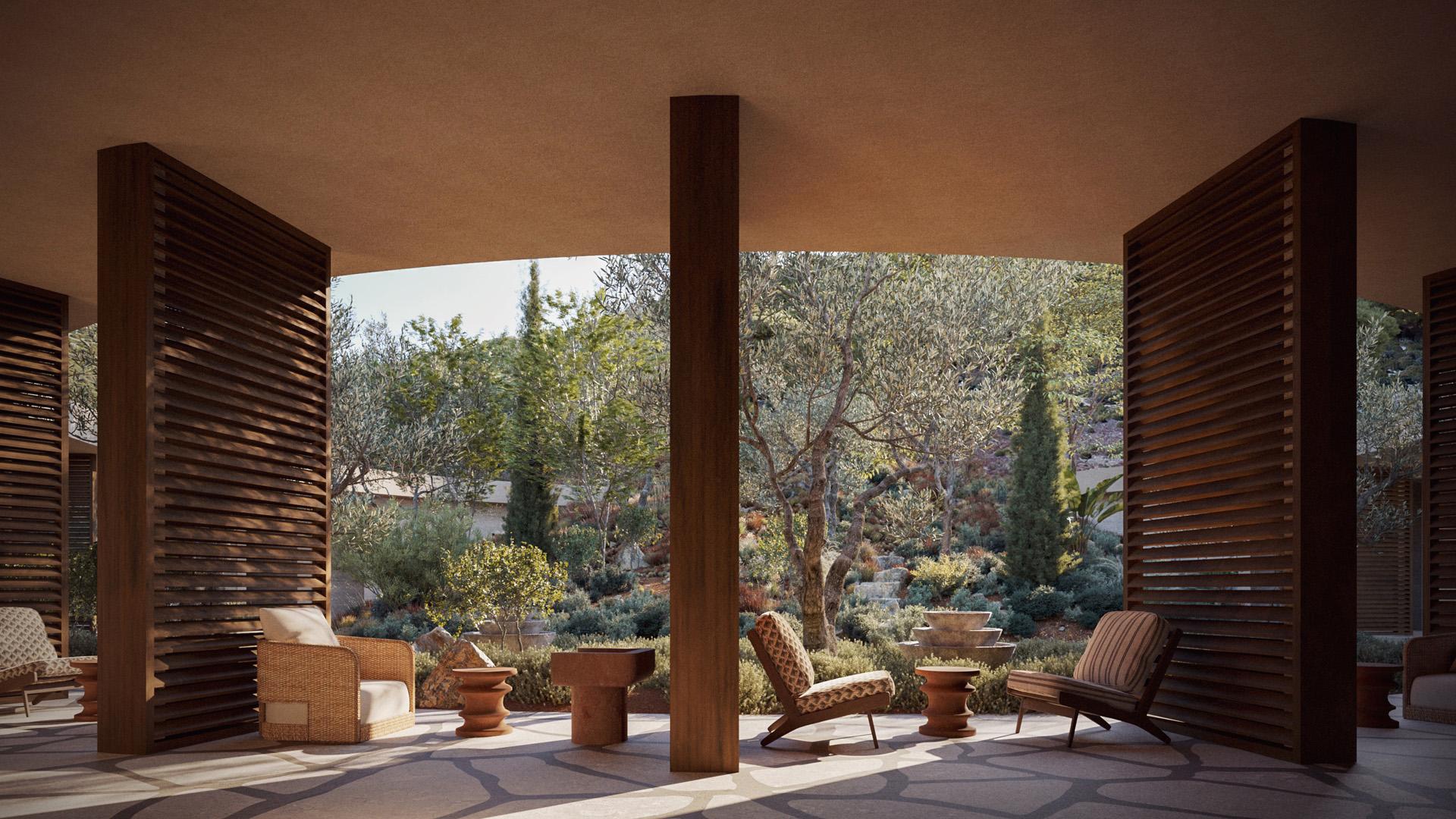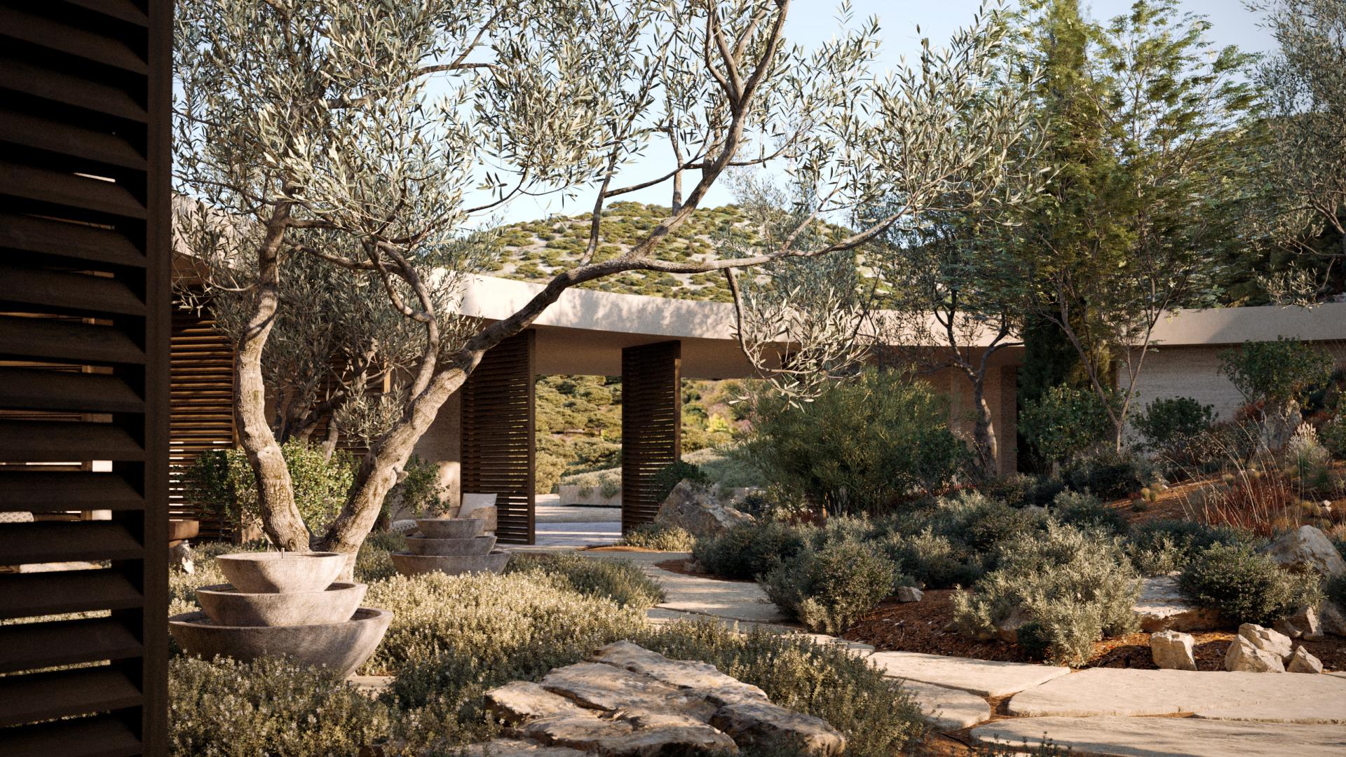 Iskustvo otoka režirano je kroz doživljaje. Pri dolasku, prvi doživljaj nije zgrada, nego miris lavande i zvuk vjetra i valova. Arhitektura ulaznog paviljona otvara prostor doživljajima prirode: kružni atrij ulaznog paviljona je mediteranski vrt. To je mjesto odmora nakon putovanja daleko od uobičajene svakodnevice te uvod u mir i obnovu.
