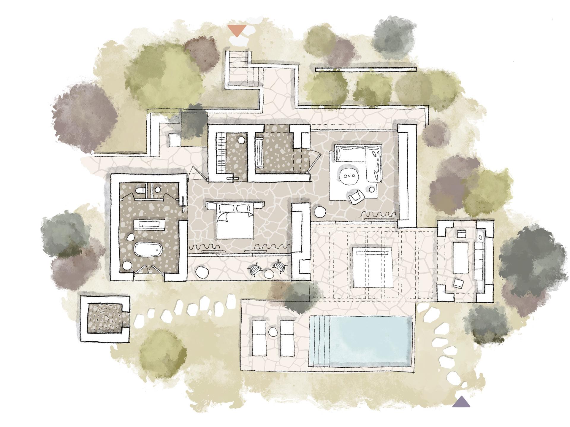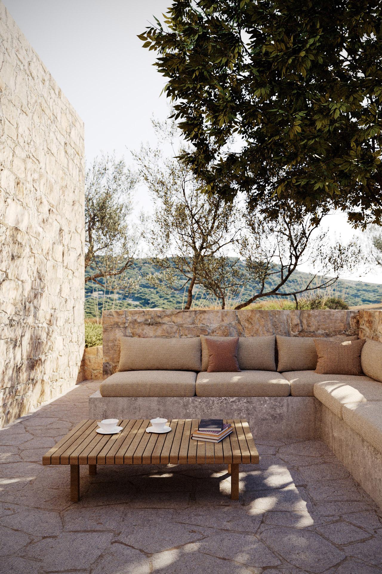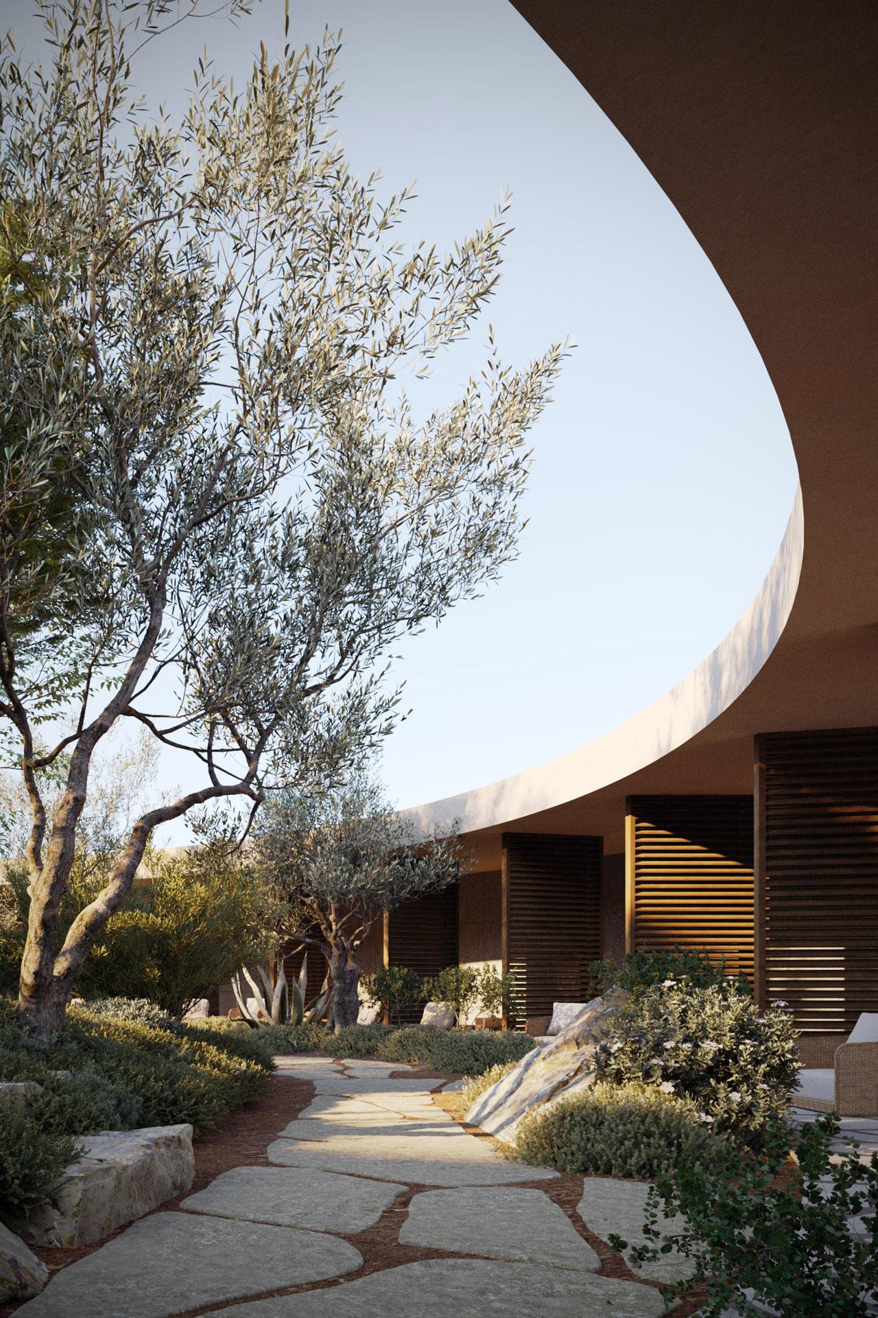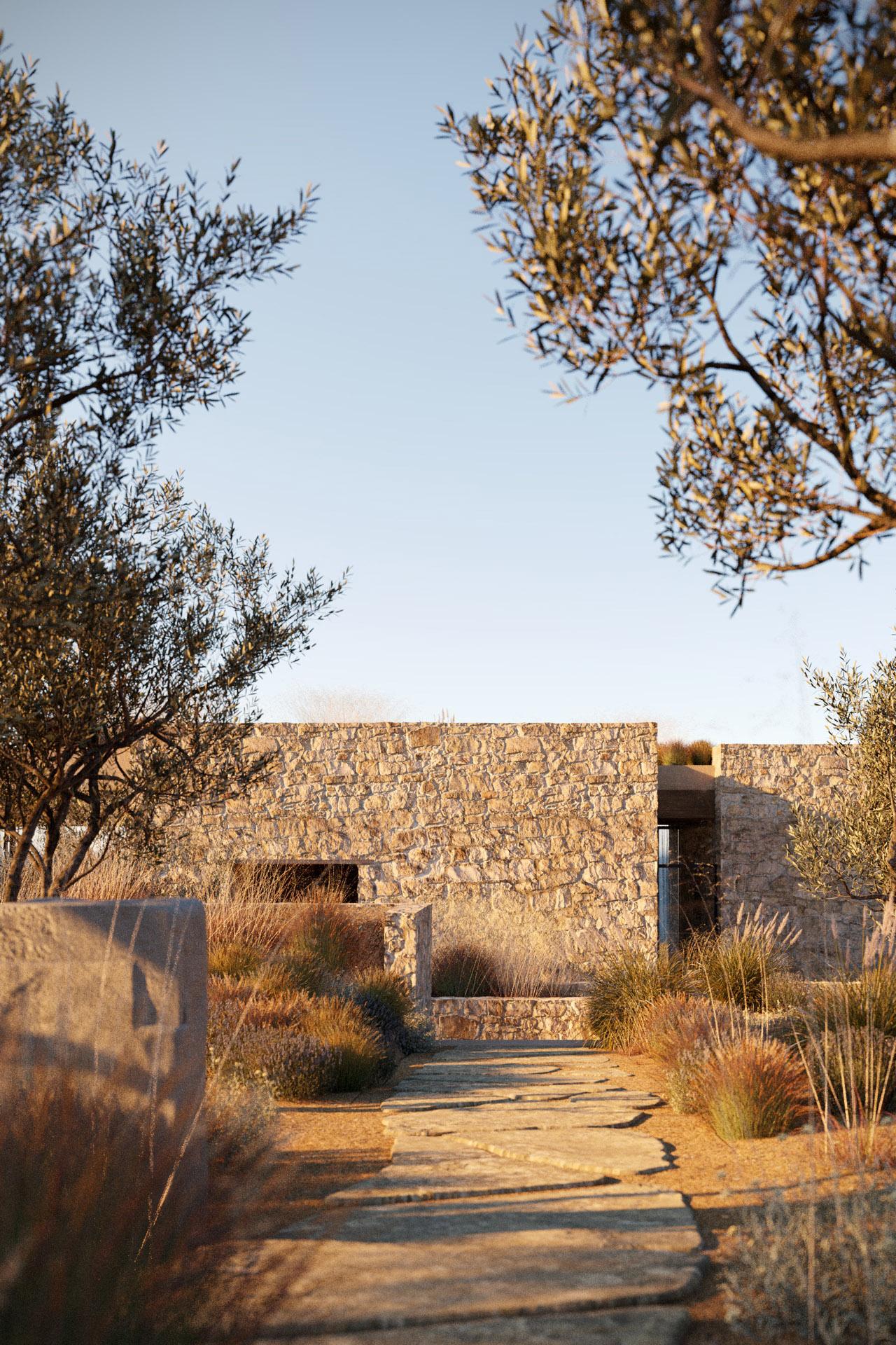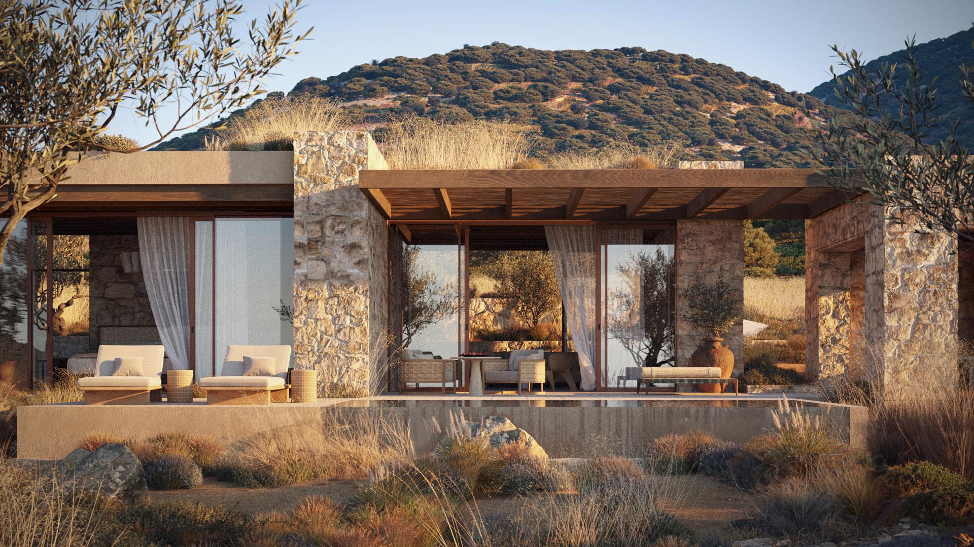 Mitato je tradicionalno, grčko, pastirsko sklonište sagrađeno od prikupljenog kamenja. Ta jednostavna građevina motivirala je oblikovanje i atmosferu smještajnih jedinica resorta: suvremenih vila i rezidencija. Svaka jedinica uronjena je u maslinik, s pogledom na more i skrivenim vrtovima i atrijima koji omogućuju intimne trenutke. Unutarnji i vanjski prostori su u dijalogu i jednako su važni.
