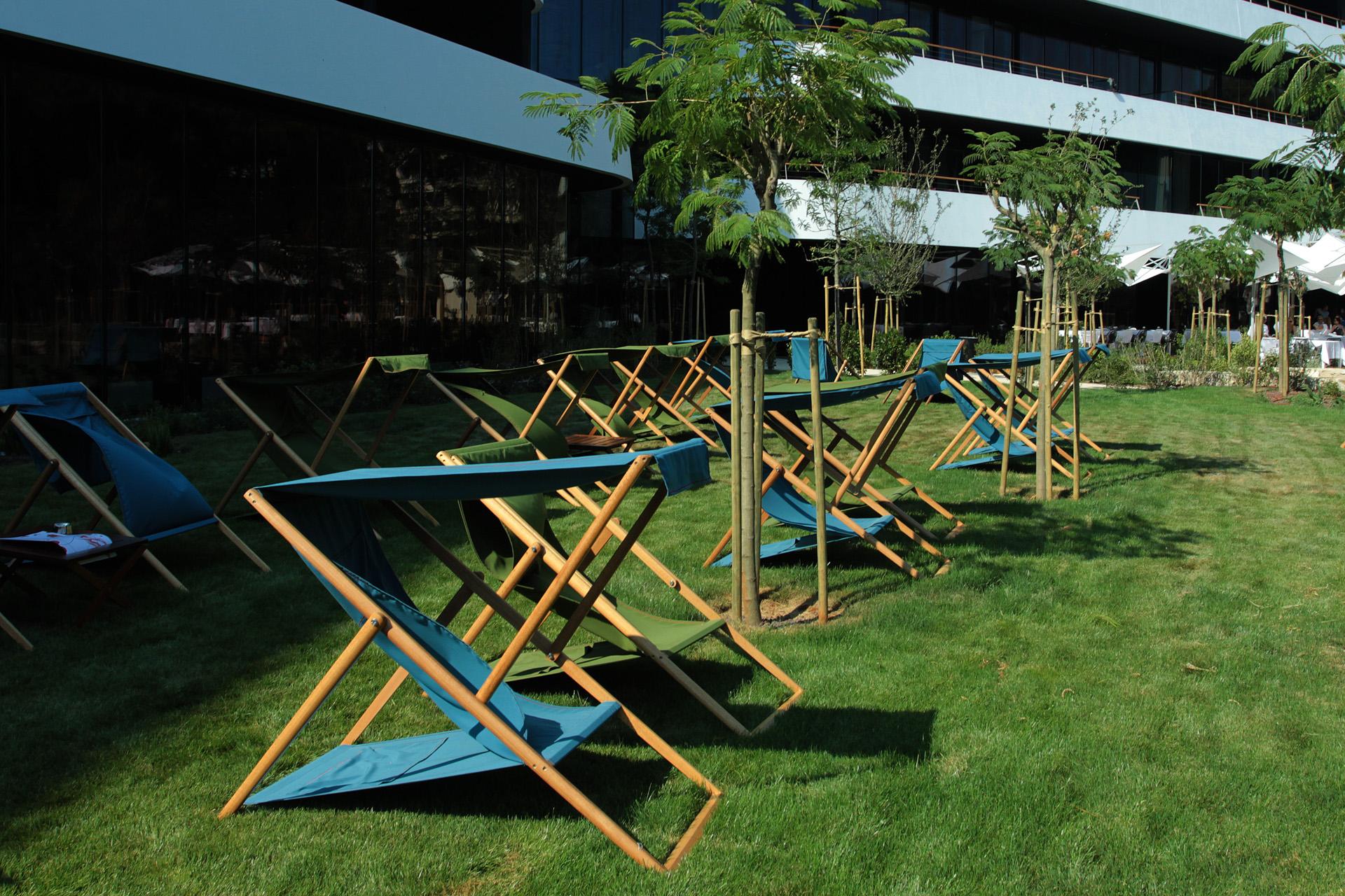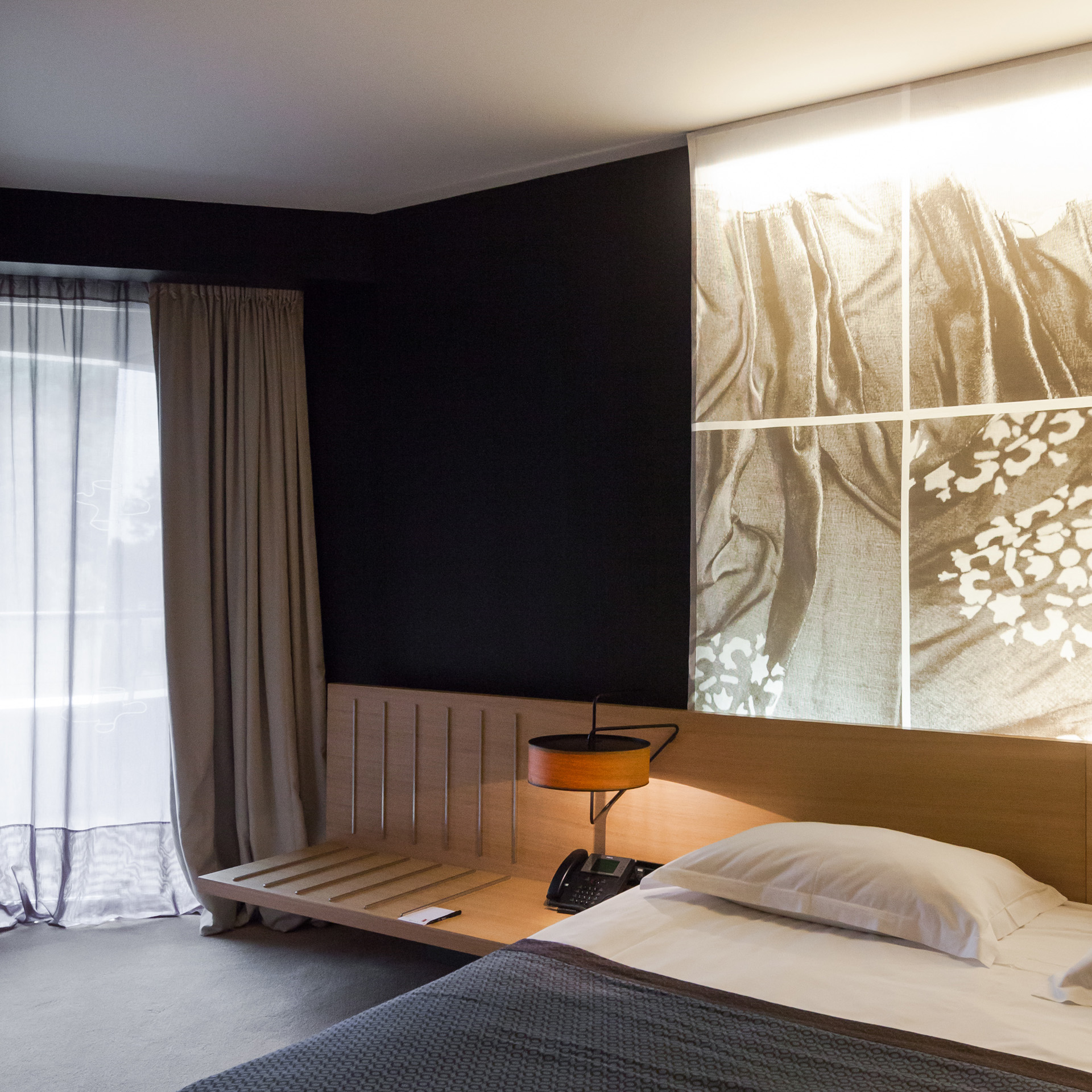 Numen / For Use, a group of product designers responsible for most of the mass-produced and custom-made furniture pieces for the hotel, was involved in the interior design phases from the very beginning. Fashion designers I-GLE were in charge of selecting the hotel’s fabrics and textiles, and were later commissioned by the investor to design the hotel staff uniforms. I-GLE are also the authors of three textile art installations in the hotel lobby. In addition to them, two other artists participated in the project – Ivana Franke, author of the hanging sculpture in the lobby titled Room for Running Ghosts, and Silvio Vujičić, author of the installation In the Hanging Garden No One Speaks – a green wall, a kind of bio-mechanism with living plants and a self-sustaining irrigation system. Silvio is also the author of a series of textile prints featured in all the rooms, based on research of frescoes from 14th and 15th-century Istrian churches, inspired by the clothing ornaments of martyrs. Studio92 is credited with the design of the Wellness & Spa centre, while Studio Kappo was responsible for landscape design. The agency Bruketa & Žinić OM conceived and oversaw the hotel’s visual identity.